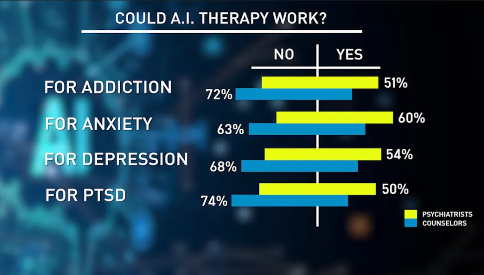 En estas preguntas, los profesionales de la salud mental mostraron mayor división: aproximadamente dos tercios de los consejeros estaban convencidos de que los «bots terapéuticos» de IA serían ineficaces. Los psiquiatras mostraron una división más equitativa, con una escasa mayoría que expresó optimismo sobre la eficacia de la terapia con IA, especialmente para la ansiedad.